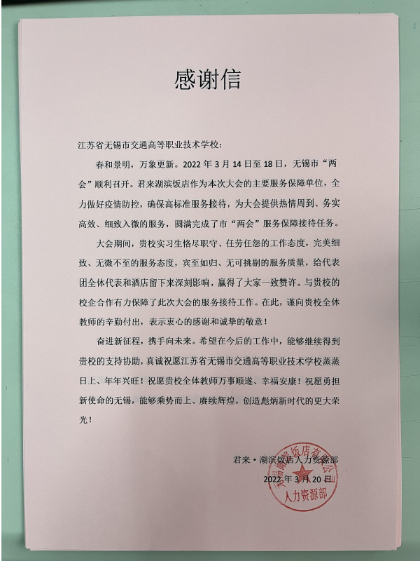 320日,无锡君来湖滨饭店向我院发来感谢信,衷心感谢船舶工程学院实习生在无锡市“两会”召开期间提供热情周到、务实高效、细致入微的服务,圆满完成了市“两会”服务保障接待任务。