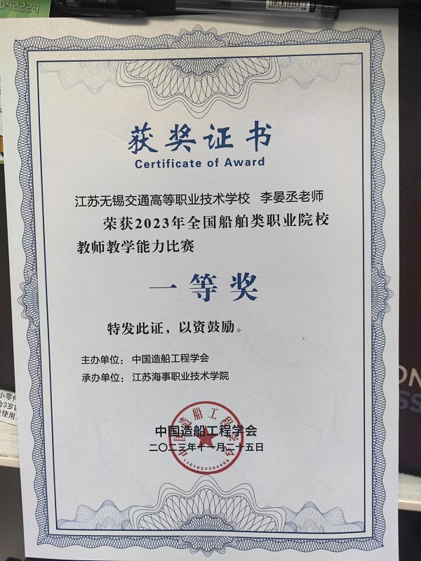 11月24日,举办2023年全国船舶类职业院校教师教学能力大赛决赛,经初赛评选,共有20名教师进入决赛,江苏海事职业技术学院副校长马洪涛担任裁判长,裁判成员由来自于省内高职院校的校领导、教务处处长组成。经过一天比赛,我校船舶工程学院教师李晏丞在2023 年全国船舶类专业教师教学能力比赛中荣获一等奖,李晏丞老师在比赛中展示了其独特的教学风格和深厚的专业知识,赢得了评委一致好评。他的教学方法新颖、实用,能够有效地激发学生的学习兴趣和主动性,提升学生的学习效果。同时,李晏丞老师还注重培养学生的实践能力和创新精神,通过实际操作和案例分析等方式,帮助学生更好地理解和掌握船舶工程专业的知识和技能。