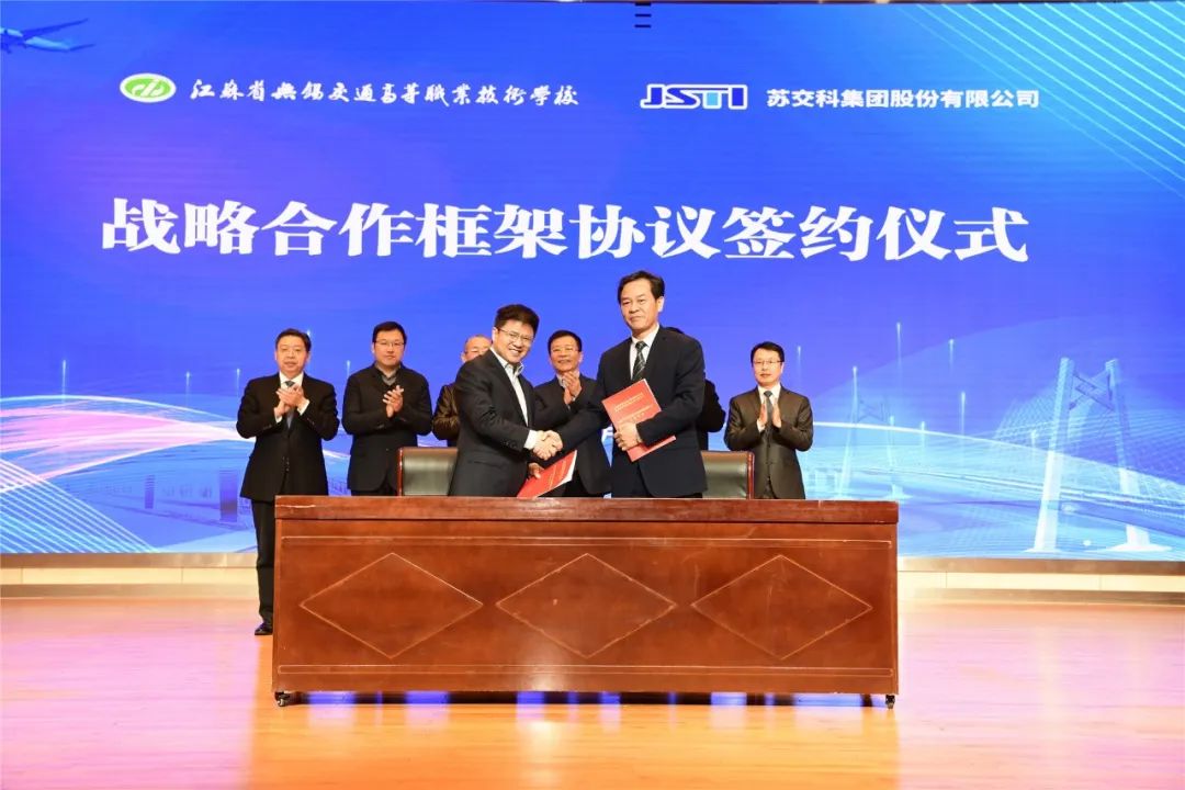 学校党委副书记、五级职员朱雨兰与苏交科集团副总裁计月华共同签订战略合作协议。耿兴华副校长与苏交科副总裁王卫共同签订共建生产性交通工程试验检测中心协议。
