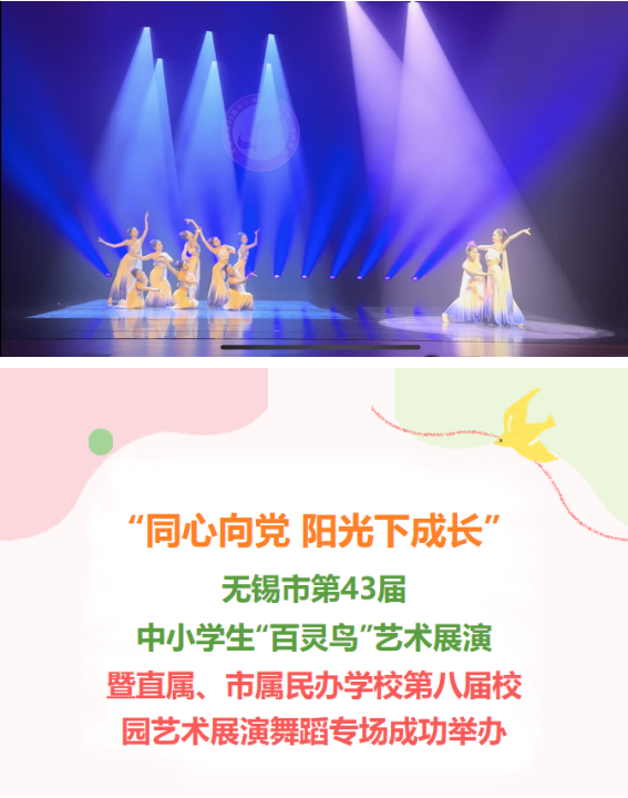 2024年无锡市第43届中小学生“百灵鸟”艺术展演暨直属、市属民办学校第八届校园艺术展于2024年514日在无锡青少年宫举行。经过精彩的表演和激烈的角逐,郭晓琳、王涛老师指导的课本剧《喜被》荣获金奖,朗诵《先锋力量薪火相传》荣获银奖,杨格格老师指导的舞蹈《云之南》荣获银奖,展现了学校美育教育的丰硕成果和学生们的卓越才艺。