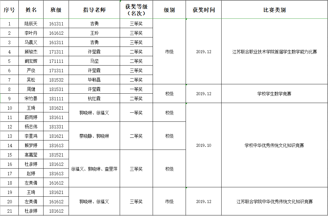2019年指导学生参加比赛获奖情况