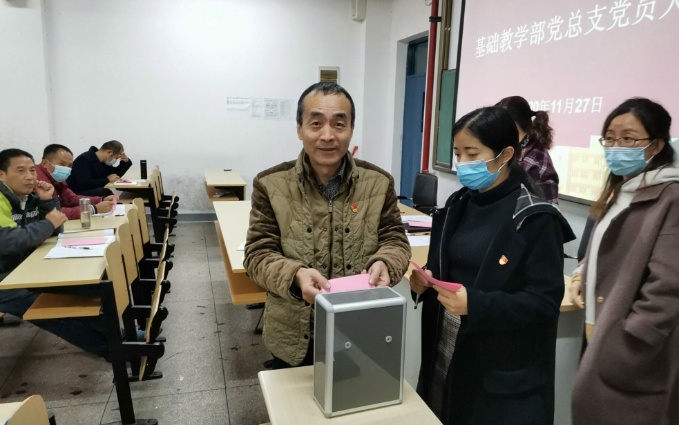 根据《中国共产党章程》规定和《中国共产党基层党组织选举工作条例》要求,按照学校党委对党总支换届选举工作的具体部署,2020年11月27日下午15:00,基础教学部党总支在弘毅楼506召开党员大会,进行党总支部委员会换届选举,发扬民主、严格要求、按照程序,顺利完成换届选举工作。换届选举大会由基础教学部党总支副书记杨凤琴主持,全体党员参与会议。