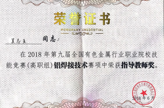 第七届全国有色金属行业焊接技术技能竞赛指导教师奖