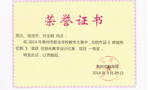 结业证书-中职生职业技能与职业精神实践研究——以江苏省靖江中等专业学校焊接技术应用专业为例