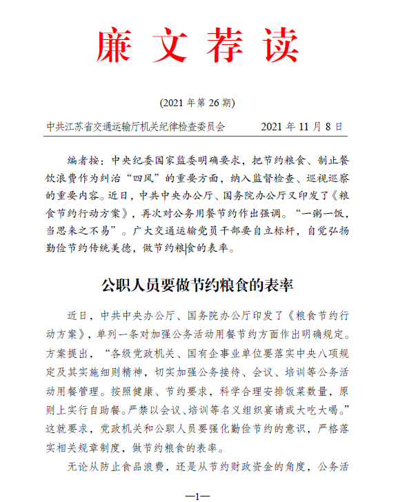 2021年廉文荐读第26期——公职人员要做节约粮食的表率