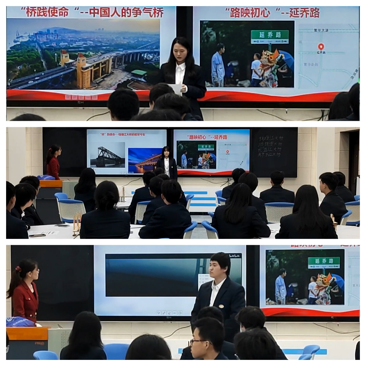 同学们运用演讲、朗诵情景剧等多种形式演绎了钱塘江大桥、南京长江大桥、北盘江大桥、港珠澳大桥、延乔路、青藏铁路、公路等道路桥梁中的四史”故事