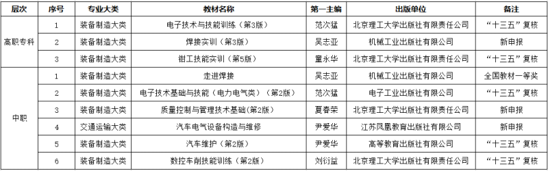 近日,教育部公示拟入选首批“十四五”职业教育国家规划教材名单,我校教师主编的9部教材入选首批“十四五”职业教育国家规划教材。其中新申报教材入选3部教材,“十三五”复核教材入选6部教材,具体入选名单见下表: