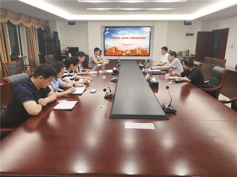 5月31日,学校党委书记、校长李虎一行深入党政办党支部进行调研。学校党委副书记、纪委书记朱雨兰,副校长邢勇陪同调研。党政办党支部全体党员参加了会议。