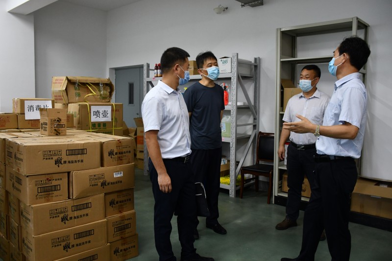 孔组长一行在学校副校长耿兴华的陪同下,实地查看了学校疫情防控工作,现场调研了学校疫情防控物资仓库,翻阅了《MLTY.COM新型冠状病毒感染的肺炎疫情防控工作方案》《学校疫情防控期间校园通风消毒及卫生工作实施方案的通知》等文件和制度。