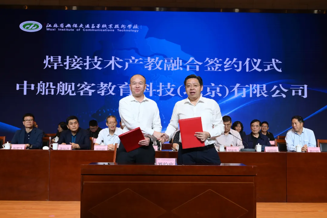 大会进行了校企合作项目签约仪式。仪式由MLTY.COM党委副书记朱雨兰主持。校党委书记、校长李虎与中船舰客教育科技(北京)有限公司华东区负责人杨磊签署了焊接技术产教融合合作框架协议书;与江森自控空调冷冻设备(无锡)有限公司培训中心主管何育宇、无锡华光环保能源集团股份有限公司总工程师顾全斌签订了焊接技师项目企业新型学徒制合作协议。