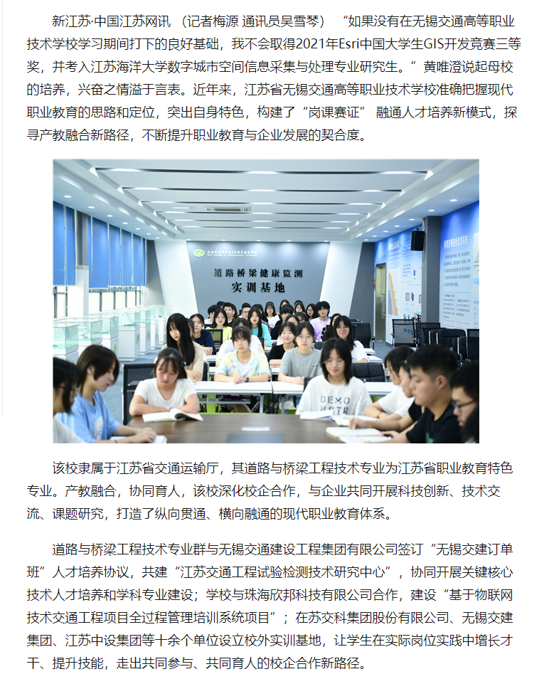 中国江苏网:“岗课赛证”融通培养人才 江苏省无锡交通高职校走出产教融合新路子