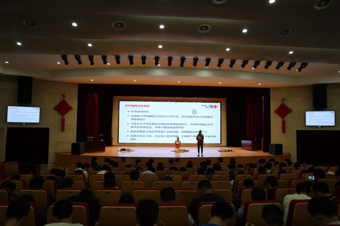 活动初始,红十字会培训老师向师生们介绍了红十字会的起源发展、工作职责、标志及“人道、博爱、奉献”的红十字会精神,使同学们对红十字会有了初步了解。随后,红十字会培训老师结合理论知识和实际救护技巧对生活中遇到突发状况急救、徒手心肺复苏、溺水紧急救护等内容作了详细讲解。为了使师生们更加深入了解各项救护技巧、掌握心肺复苏要领、培训老师和师生们在现场展开了深入互动,对心肺复苏进行了实操演练、手把手向同学们传授了急救手法和注意事项。
