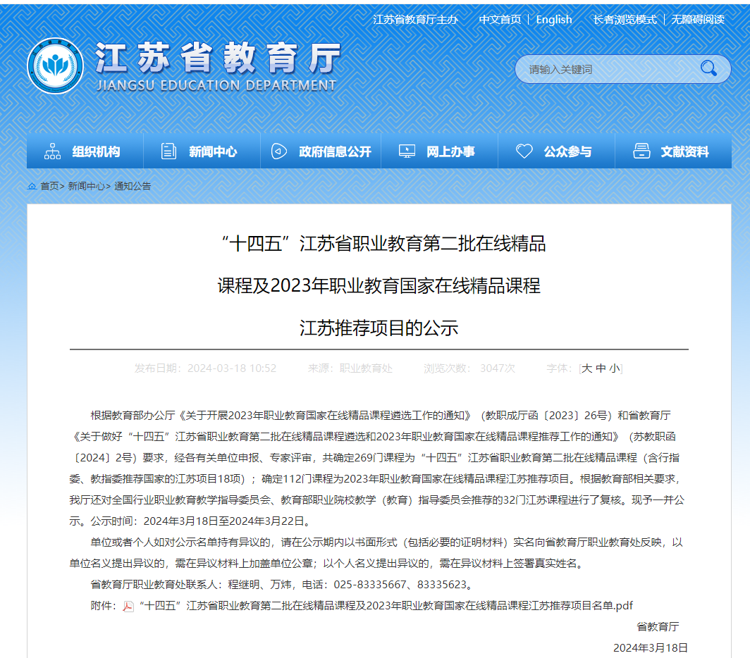 本次江苏省共确定269门课程(职业本科3门、高职214门、中职52门)为“十四五”江苏省职业教育第二批在线精品课程,112门课程(职业本科1门、高职83门、中职28门)为2023年职业教育国家在线精品课程江苏推荐项目。截至目前,学校共有6门省级在线精品课程,获评数量位居全省同类学校前列。