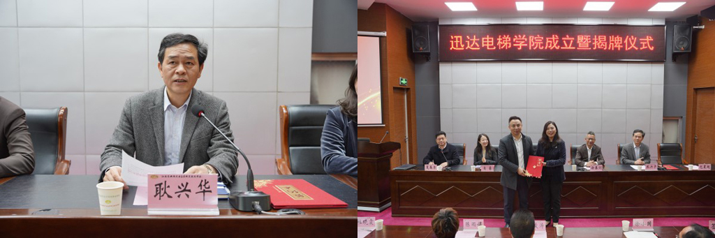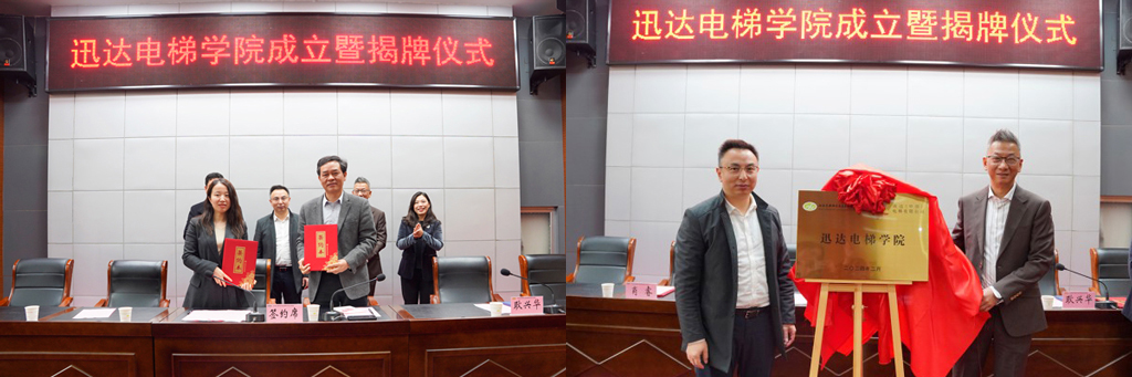 仪式上,副校长耿兴华、迅达(中国)电梯有限公司苏沪区人力资源高级经理肖睿代表校企双方签署了共建学院协议,校长李进、迅达(中国)电梯有限公司苏沪区总经理徐春剑共同为迅达电梯学院揭牌。