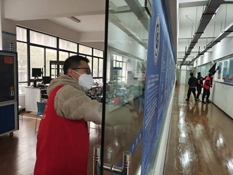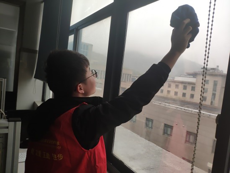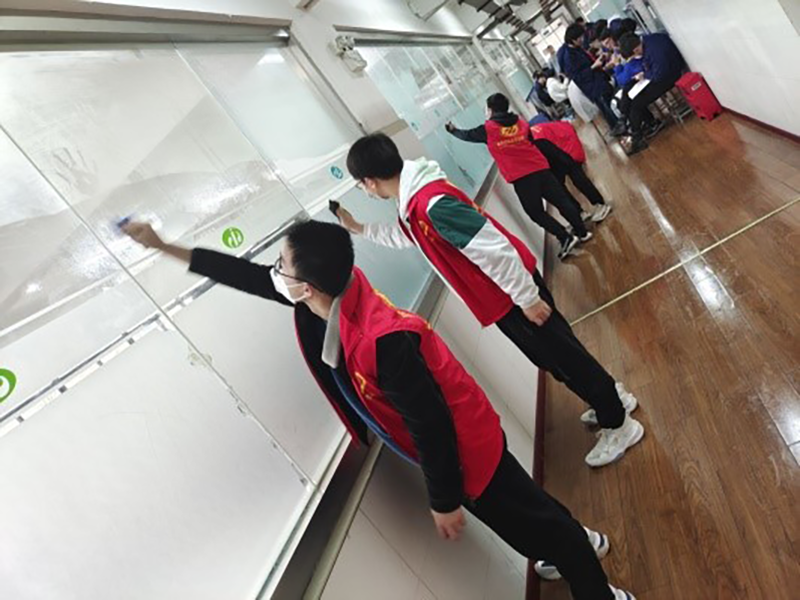 在班主任蔡昱灿老师的带领下志愿者们被分成了9个小组。每个小组都有着各自的任务。活动中,志愿者在各自负责区,发扬不怕苦、不怕累的奉献精神,将学校的实习楼中的垃圾和卫生死角进行了集中清理,擦拭着每间教室的门和窗户,地板也被打扫的一尘不染。经过大家齐心协力、分工合作,实训楼焕然一新。