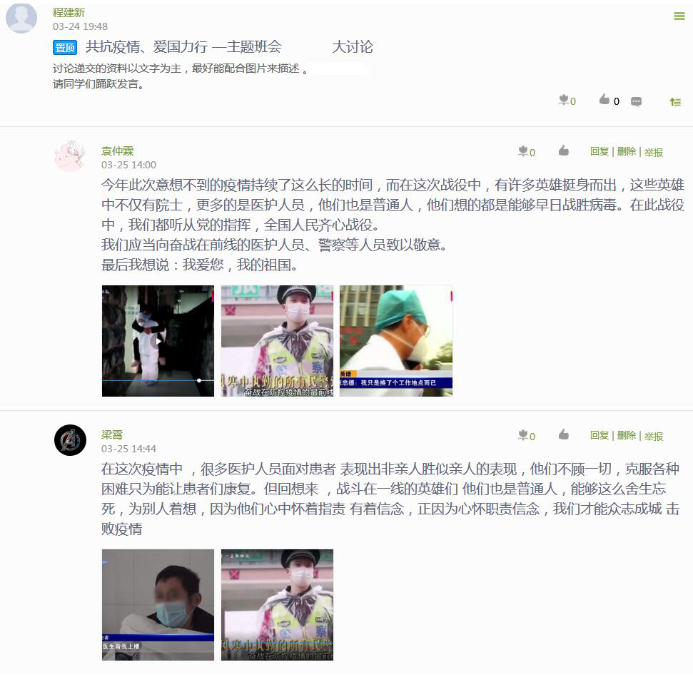 接着,同学们积极地进行了讨论,发表自己最真实的想法。有同学说到:这不仅仅是中国的一次危机,也是全人类的一次危机。好在中国及时地发现并作出相应对策,如今疫情也得到了相应的控制,为中国点个赞!
