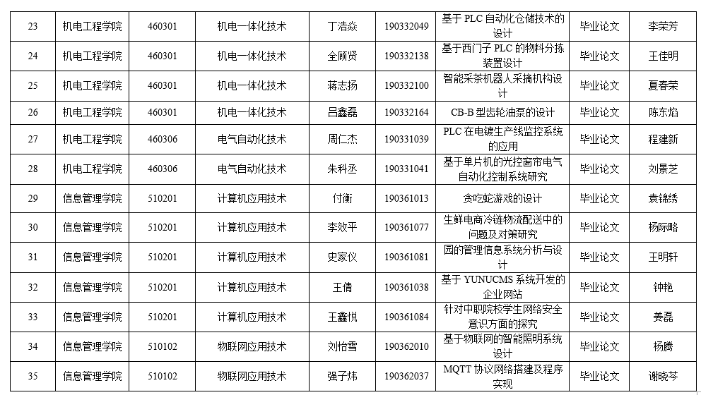 根据《关于做好2024届毕业生毕业论文(设计)答辩及优秀毕业论文(设计)认定的通知》,经各学院遴选推荐、组织专家评审,拟认定35篇作品为2024年学校五年制高职优秀毕业论文(设计),拟获奖名单详见附件1,现予以公示。公示期限:202475日—2024711日。如有异议,请与教务处卢波老师联系,联系电话:0510-68781133
