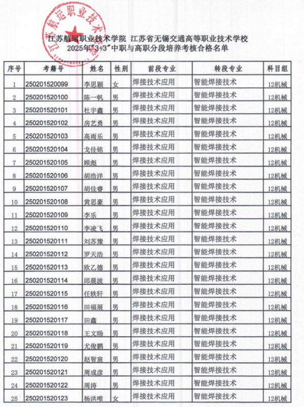 根据学校与江苏航运职业技术学院关于2022级焊接技术应用专业中高职“3+3”分段培养项目的合作规定,以及《关于进一步完善现代职业教育体系建设试点项目转段升学工作的意见(试行)》(苏教职[2014]31 号)、《江苏航运职业技术学院与中等专业学校“3+3”分段培养试点项目转段办法》的要求,1115日经江苏航运职业技术学院对我校2022级焊接技术应用专业212121班(3+3)学生进行了转段考核,李思颖等25名同学满足中高职衔接的高职入学条件。