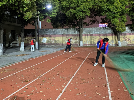 44日晚上,大风把香樟树的叶子吹落了一地。同学们自觉放下手机,主动的扛起扫把,来到操场上,借助路灯的光亮,把校区的跑道、篮球场打扫得干干净净。春天的夜晚还有些许凉意,志愿者们却全然不顾,他们干得一丝不苟,干得热火朝天。疫情下的每一位同学都是无比的可爱。