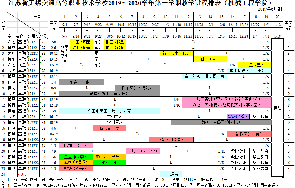 机械工程学院2018~2019学年第一学期教学进程排表