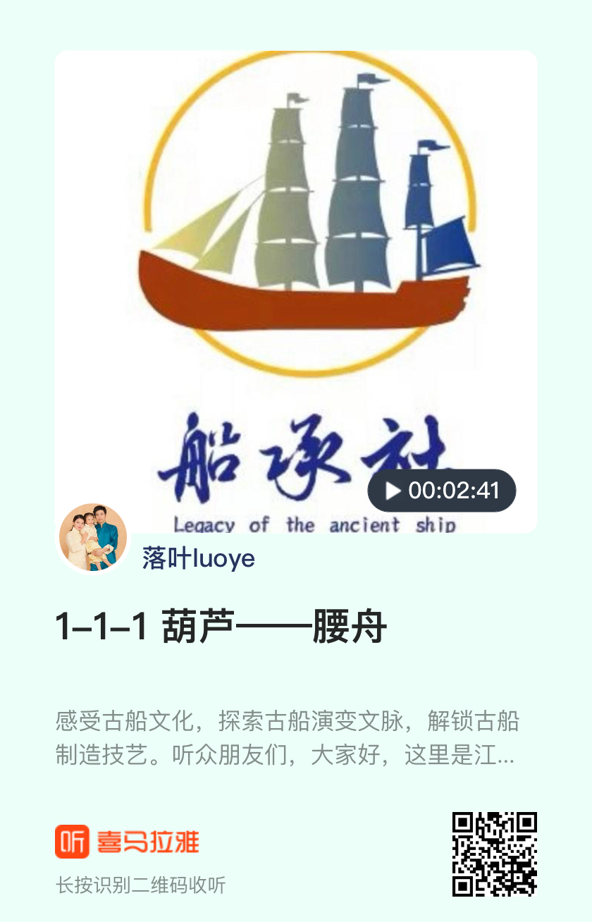 船文化”系列音频栏目正是在这种情况下萌芽、诞生,本栏目将带你用耳朵感受古船文化,探索古船演变,解锁古船制造。