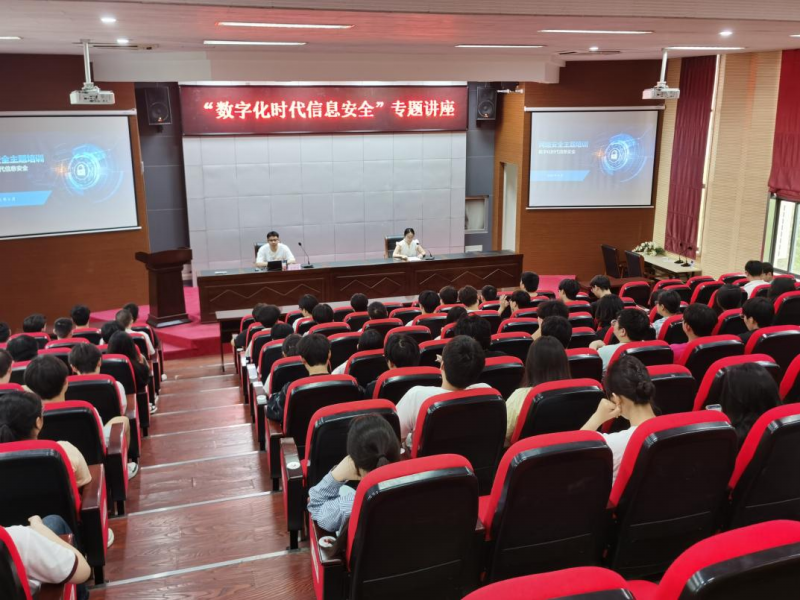 为了增强学生网络安全意识,提高网络安全防范技能。2025年5月21日,图文信息中心在求实楼学术报告厅组织了一场以“数字化时代信息安全”为主题的网络安全专题讲座。本次讲座特别邀请了江苏联通网络安全工程师张惠寅作为主讲嘉宾,讲座由图文信息中心陈婷薇老师主持。来自二级学院200余名师生代表聆听了讲座。