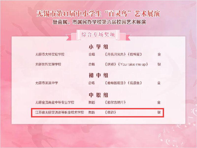 暑期,无锡市第41届中小学生“百灵鸟”艺术展演暨直属、市属民办学校第六届校园艺术展演在无锡市少年宫举行。经过激烈的角逐,我校的朗诵《永生》、舞蹈《傣韵》在全市各级各类学校选送的37个作品中脱颖而出,分别获得语言专场银奖和综合专场银奖。