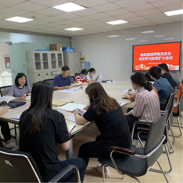 5月25日下午,信息管理学院党总支在学院三楼会议室召开党史学习教育扩大会议,集中开展党史学习教育并部署近期重点工作,会议由郑智飞同志主持,全体党员参加会议。